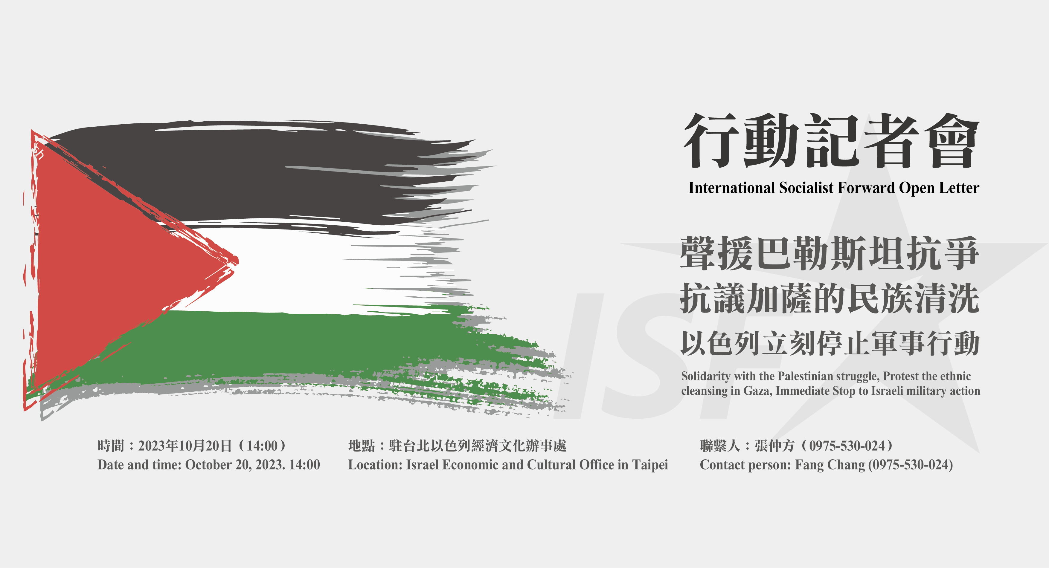 現在,國際上許多左派、人權組織已經團結起來,聲援巴勒斯坦的受壓迫者。我們認為,台灣不應該在這樣的國際聲援當中缺席,因此,我們誠摯邀請所有關心巴勒斯坦人民權益的朋友,10月20日至駐台北以色列經濟文化辦事處外,反對以色列的軍事行動與暴行。