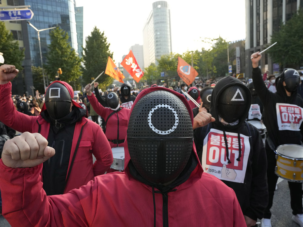 這樣惡質的勞動環境,也反映在10月的罷工中。罷工者穿上了電視劇《魷魚遊戲》的招牌服裝,以此諷刺他們夾縫中求生存的悲慘處境。來自於高壓工作環境的壓力,使南韓成為OCED國家中自殺率最高的國家,更使絕大多數成年人的心理壓力被工作所綁定。