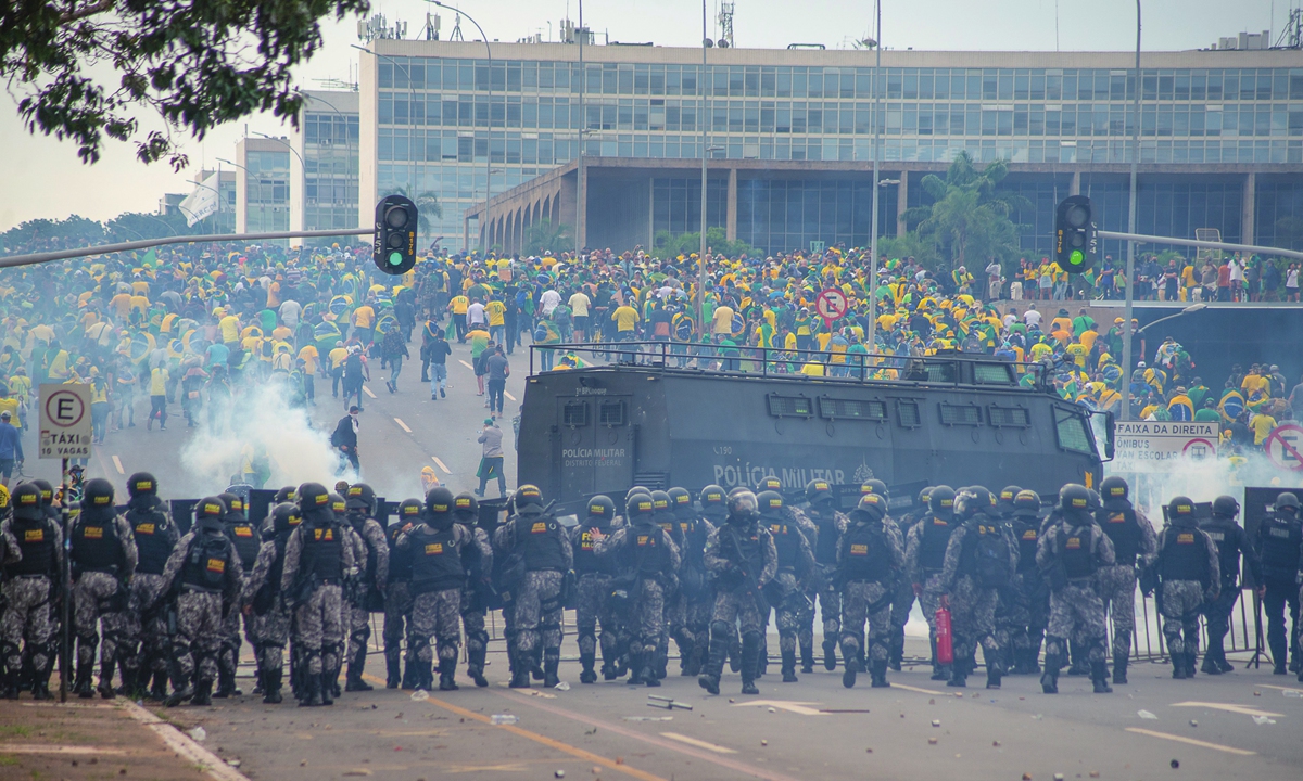 8日當天現場沒有警察。暴動者找到了一條通道,闖入了政府建築和總統府的玻璃牆的。負責此類行動的警察通常是州政府控制的州憲兵。但是聯邦區州長是博索納羅的盟友。此外,聯邦區安全部長 Anderson Torres,聯邦區警察機關的最高負責人,直到去年12月還擔任博爾索納羅的司法部長。Torres 在盧拉上任時離開了中央政府,到聯邦區上任,並在事件發生前幾天飛到博爾索納羅所在的美國佛羅里達州奧蘭多市。因此,那天沒有警察保護這些建築物。