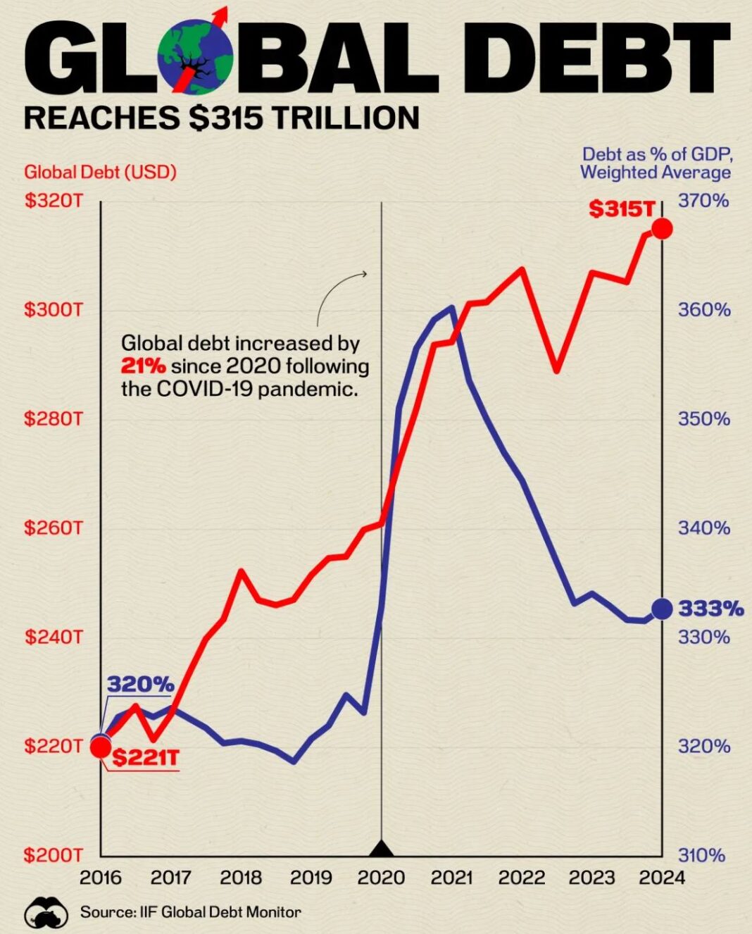 12.然而,整體形勢依然極度不穩定,過去一段時期及對未來的世界經濟平均增長率均創下第二次世界大戰以來的最低紀錄。而支撐全球經濟的「定時炸彈」──龐大的公私部門債務──至今仍未解除。疫情過後,各政府本應透過緊縮支出來對抗通膨,卻導致債務規模進一步攀升。2024年第一季,全球債務總額飆升至315兆美元新高,相當於全球GDP的333%,其中約三分之二由已開發經濟體所貢獻。過去十年,全球債務增加逾100兆美元,並自2020年疫情爆發以來更在名目數據上增長了21%。在增長率低迷、高預算赤字與高債務水平並存的局面下,股市與房市的巨型泡沫難以為繼,遲早它們將以劇烈的崩盤告終,並最終反映到實體經濟中,極可能引發一次嚴重的經濟衰退。