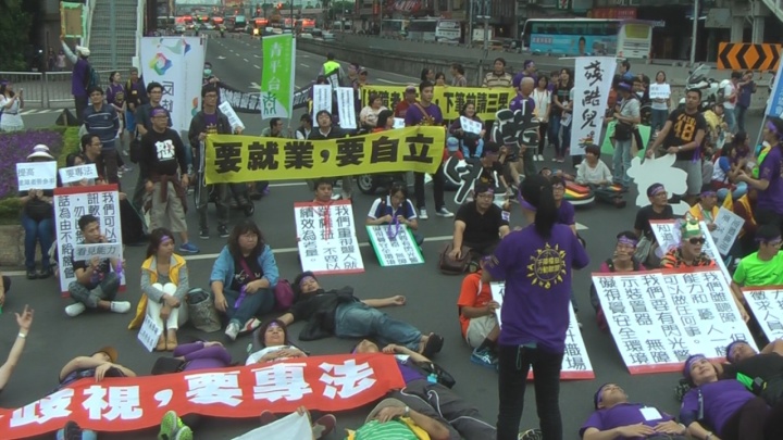 身心障礙者遊行提出反對歧視的訴求,要求政府提供身心障礙者制度性的補助與保障,爭取身障者就業與自立生活的可能。(圖:公民行動影音紀錄資料庫)